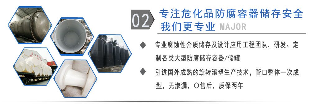 公司有鋼襯塑PE/PO、PE全塑、碳鋼、不銹鋼四大系列100多個品種,專注于常壓儲存容器生產,其產品包括鋼襯塑儲罐、管口一體成型PE儲罐、碳鋼儲罐、不銹鋼儲罐、反應釜、攪拌罐、離子交換柱、鋼襯PE/PO儲罐、塑料儲罐、鹽酸儲罐、硫酸儲罐等等。更大限度滿足廣大客戶的各種需求,同時可以根據客戶的需要加工定制各種防腐設備。
